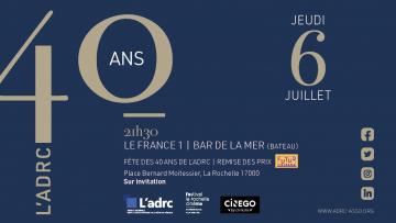 En 2023, l'ADRC fête ses 40 ans. L'Agence les célèbrera prochainement lors d'une soirée festive dans le cadre du FEMA de La Rochelle, le jeudi 6 juillet (21h30) à bord du France 1 | Bar de la mer avec l'aimable participation de CINEGO. Sur invitation.